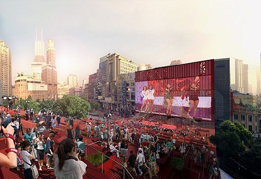 Red carpet – это урбанистическая концепция, придуманная архитекторами бюро 100architects для одной из площадей в центре Шанхая. Сутью бульвара, проходящего через эту площадь и соединяющего порт с метрополией, стала связь между Востоком и Западом. Это ось социальной активности города. Однако в последние годы здесь не хватало какой-то изюминки, которая бы привлекала посетителей. Именно поэтому и родилась идея «красной ковровой дорожки» впечатляющих размеров. Архитекторы спроектировали на бульваре открытый амфитеатр, приглашающий туристов и местных жителей насладиться различными культурными мероприятиями и просто отдохнуть от шопинга. С южной стороны, под трибунами, расположилось крытое помещение, внутреннее пространство которого используется как небольшой бар, где имеются общественные туалеты и другие удобства. Конструкция состоит из металлических ферм, поддерживающих сборные бетонные блоки, из которых выстроена горизонталь. Прочие элементы сделаны из красного дерева и металлических панелей. Стена здания напротив кресел и пешеходной зоны отделана перфорированными алюминиевыми панелями, и представляет огромный экран.