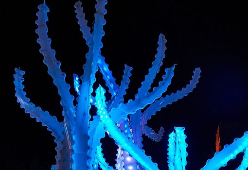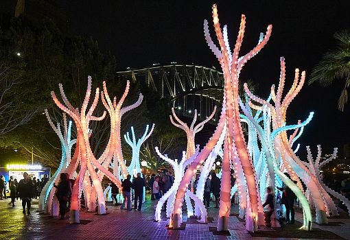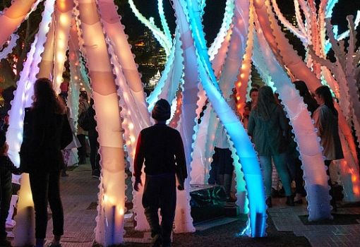 В Сиднее (Австралия) расположилась динамичная инсталляция от Abedian School of Architecture. Композиция из 1900 синтетических элементов, вдохновленная мангровыми зарослями и фантастическим миром фильма «Аватар», создана из пластика HDPE. Динамика структуры заключается в изменении цвета элементов в зависимости от различных условий среды.