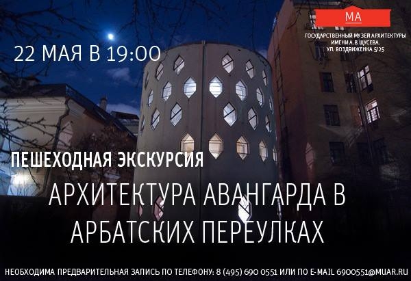 22 мая в 19:00 Музей архитектуры им. Щусева приглашает принять участие в пешеходной экскурсии "Архитектура авангарда в арбатских переулках", хронологические рамки которой охватывают период 1920-х - начала 1930-х годов. В центре внимания будут сюжеты, связанные не только с концепциями, но и с реальной практикой деятельности архитекторов-конструктивистов.