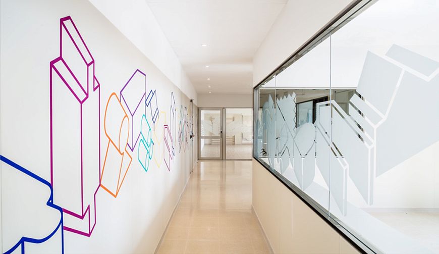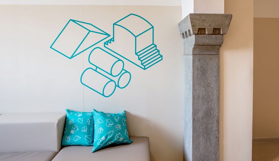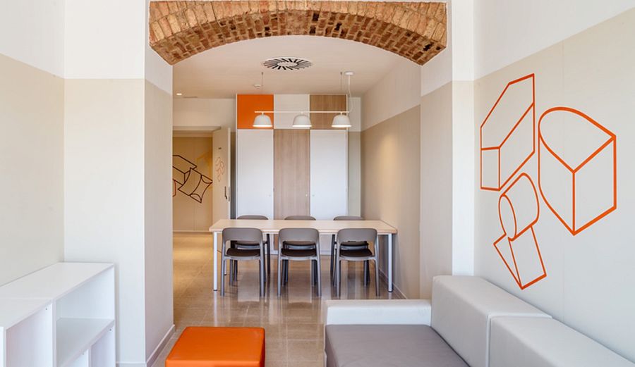 Рисунки, созданные дизайнерами, напоминают пиктограммы или переводные картинки, «героями» которых стали преимущественно архитектурные элементы и детали неоготического здания монастыря. Причем эти пиктограммы использованы не только в декоре стен или прозрачных перегородок, но и в тканевых паттернах (шторы, постельное белье, обивки). То есть, речь действительно идет о визуальной айдентике. Интерьер центра разделен на жилые блоки. В каждом из них три спальни, гостиная, столовая, кухня, ванная комната и кабинет социального либо медицинского работника. В блоках для детей авторы использовали теплую цветовую гамму для пиктограмм, а в блоках для подростков – более четкую, холодную, темную.