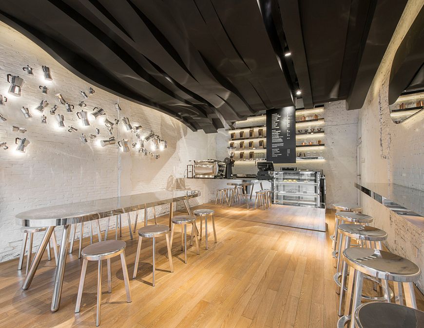 В этой оригинальной конструкции дизайнер передал «физическую формулу аромата кофе», по его собственным словам. Кроме потолка особенностями пространства являются минималистская стилистика с индустриальными мотивами, освещение в виде интегрированной подсветки и контрасты цветов.