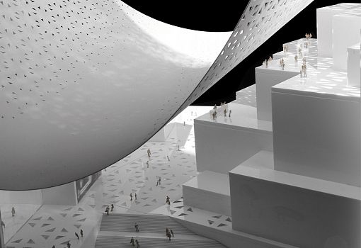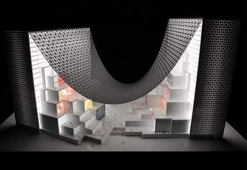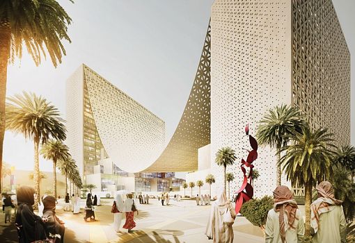 Еще один проект офиса медиакомпании представила фирма BIG. Речь идет о крупном ближневосточном медиаконцерне. В основе композиции две кубические башни общей площадью 650 000 кв. м, соединенные гигантским навесом. Он символизирует социальную связь между СМИ и обществом. Разработчики также предусмотрели общее пространство для взаимодействия: столовая, фитнес-центр, банк и зрительный зал. Террасы на крыше могут быть использованы сотрудниками, работающими в разных подразделениях компании. Будут здесь и более закрытые помещения с повышенным уровнем конфиденциальности.