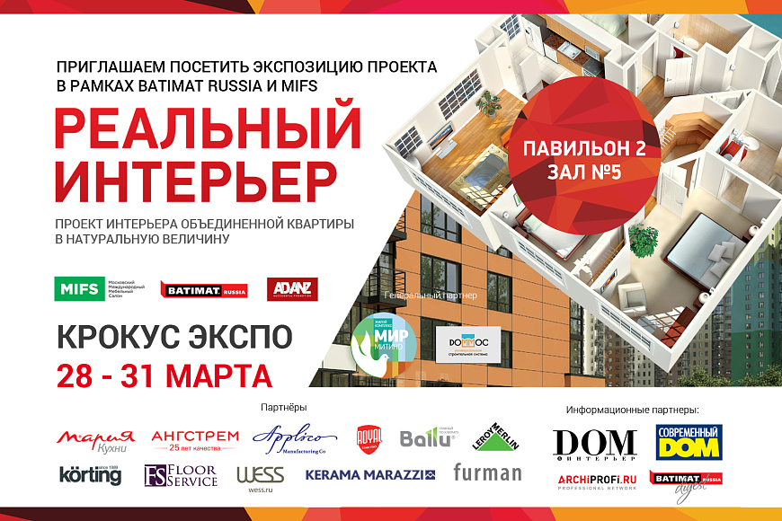 Работа победителей конкурса будет реализована в виде полномасштабного макета с использованием реальных предметов и материалов на территории выставочного комплекса «Крокус Экспо» в период проведения выставок Batimat Russia 2017 и «Московский международный мебельный салон MIFS 2017» с 28 по 31 марта 2017 года.
