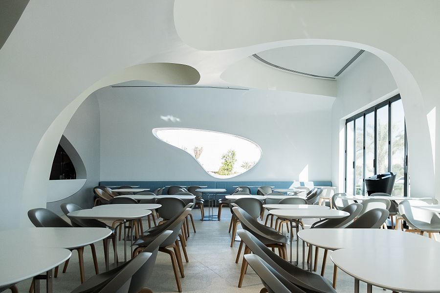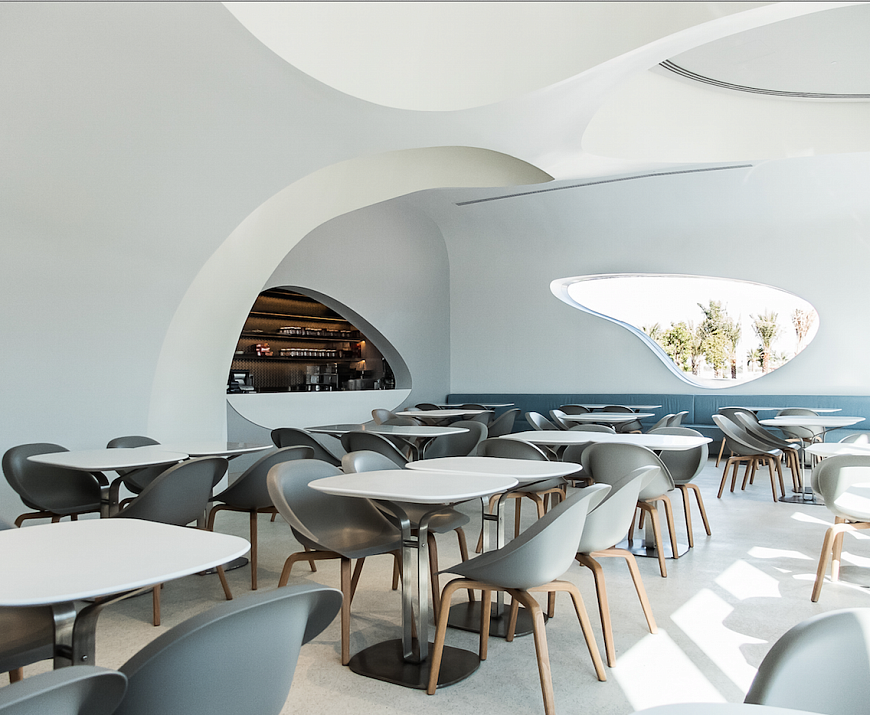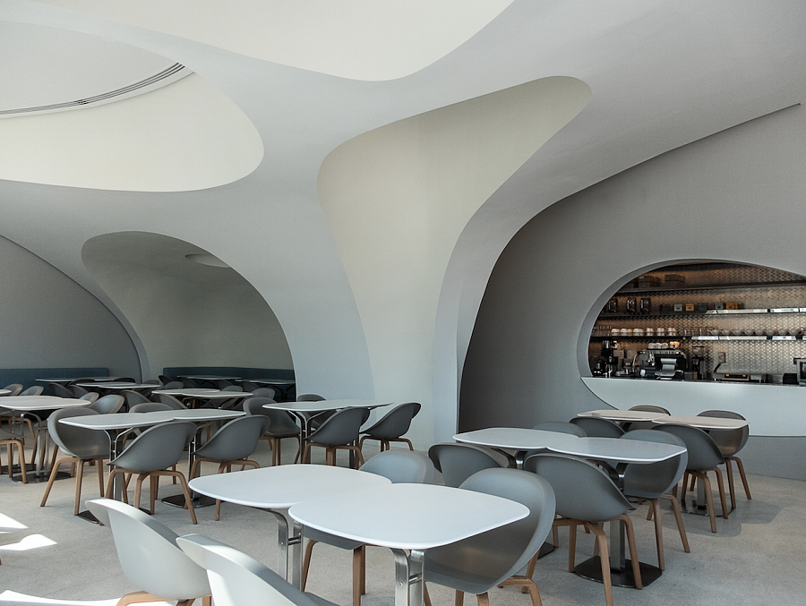 Он применил традиционный для себя прием, соединив эстетику 50-х готов со «стилистикой будущего», создаваемой самим автором. Примером этой стилистики можно назвать криволинейные вырезы во внутренних стенах ресторана. Колористическое решение характеризуется использованием сдержанной холодной гаммы.