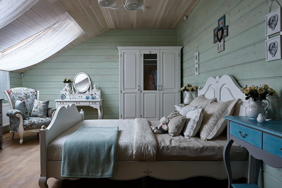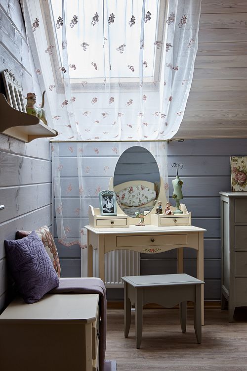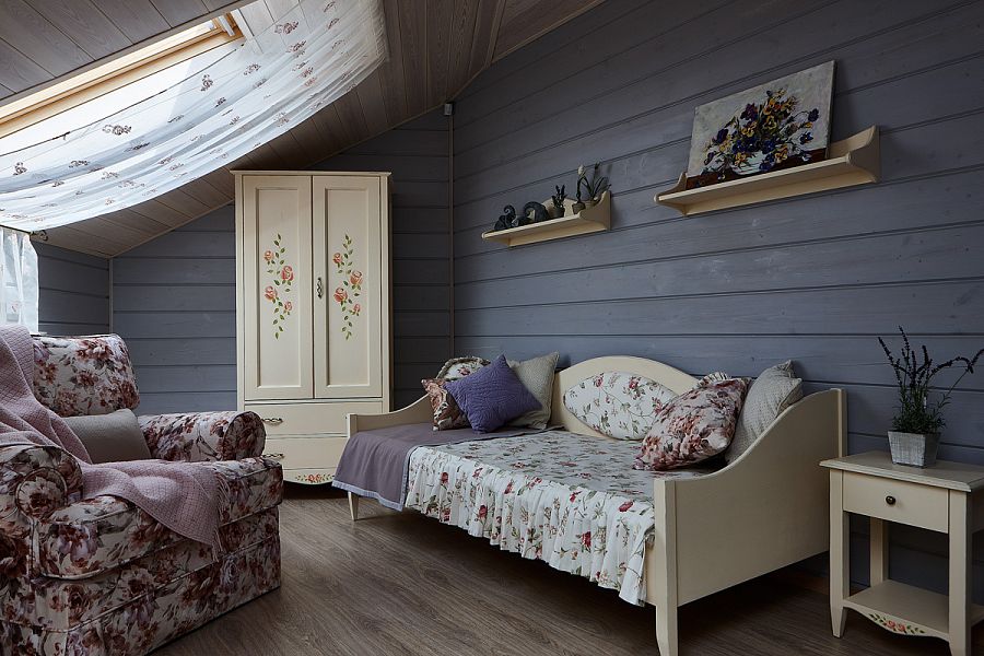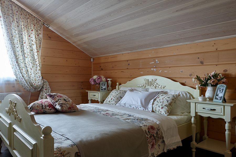 Спальни в доме оформлены в неоклассическом стиле с легкими нотами прованса. Главная спальня решена в естественных оттенках стен, пола и потолка с акцентами серого и сиреневого цвета. Небольшая детская - в активной гамме синих и серых тонов, гармонирующих с мебелью цвета сливочной карамели и цветочными принтами с винтажными мотивами.