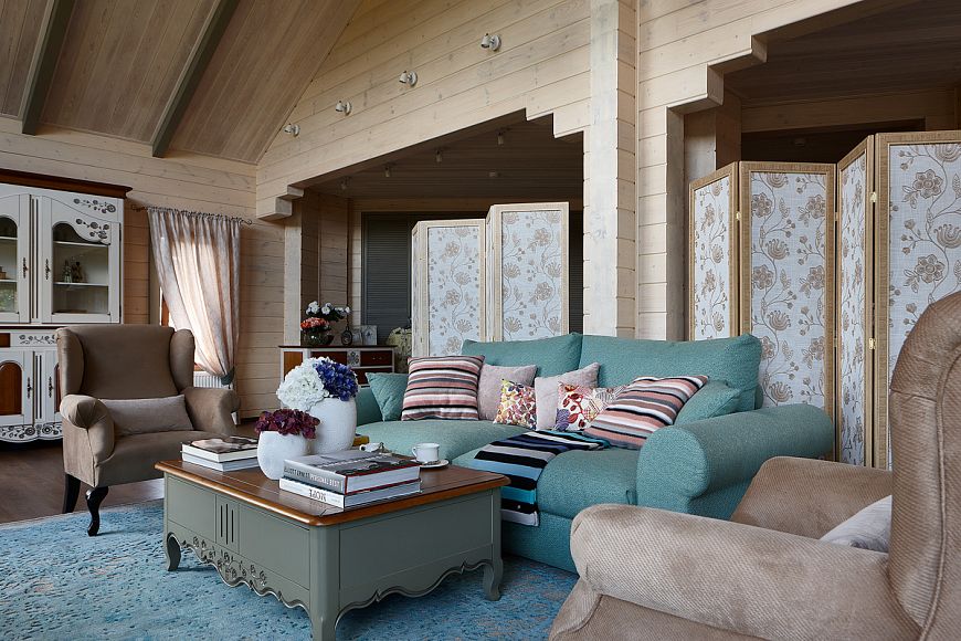 Тепло дерева, преобладающего в интерьере в строительных и отделочных материалах, мебели и аксессуарах, гармонично сочетается с теплыми оттенками в текстиле.