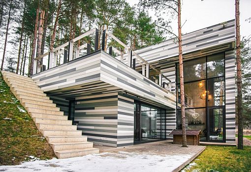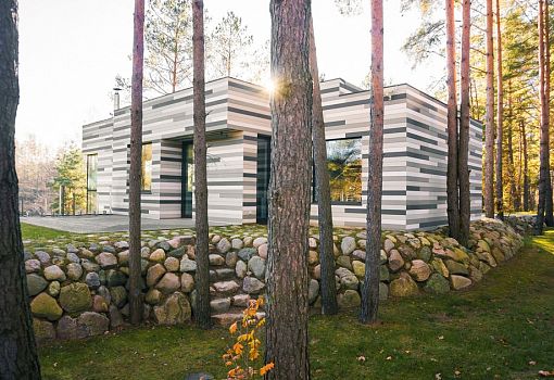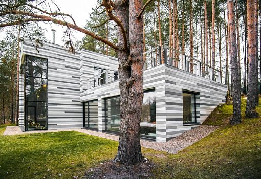 Современный частный дом расположен вблизи реки Няриса (Литва). Объект бюро GYZA буквально противопоставлен окружающему ландшафту. Мало того, что горизонтальные линии фасада «под березу» контрастируют с окружающим сосновым лесом, но еще постройка из нескольких прямоугольных объемов акцентирует внимание именно на архитектуре. Сооружение, интегрированное в холм, занимает площадь в 226 кв.м.
