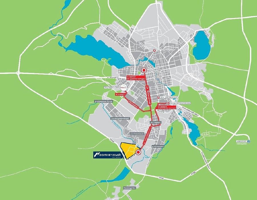 «Солнечный» строится в Чкаловском районе Екатеринбурга. В 2017 году численность населения составит 2,5 тыс. жителей, перспективная численность — 57 тыс. жителей. Общая площадь микрорайона составляет 362 га.