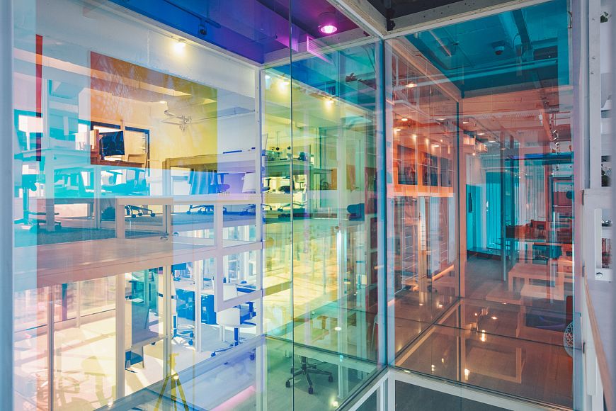 По словам авторов, в качестве объектов вдохновения (пусть и сопоставить их можно с огромным трудом) им пришли на ум, во-первых, Храм Святого Семейства Антонио Гауди, а во-вторых, типичные и всем знакомые детские игровые городки. Казалось бы, странные параллели. Дело в том, что внутреннее пространство офиса представляет собой разноуровневую металлическую каркасную структуру, почти целиком остекленную, причем стекло оклеено специальной дихроической пленкой 3M. Получается оптический эффект: при обзоре с разных углов цвет стекла меняется. Архитекторы уверяют, что схожий эффект можно наблюдать при осмотре протравленных витражей Sagrada Familia. Что касается сравнения с детским городком, то тут авторы скорее стремились передать живость и оригинальность офисной атмосферы.