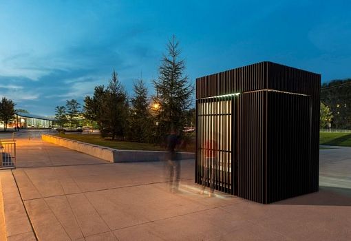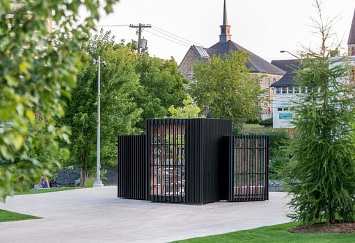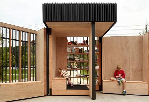 Неординарный проект библиотеки предложили архитекторы бюро Atelier Kastelic Buffey в Онтарио (Канада). Раскладной объем предлагает места для чтения, готовые принять посетителей и днем и ночью. Причем в темное время суток этому способствует светодиодное освещение, работающее от электричества, накопленного солнечными панелями за день. Конструкция выполнена из дерева.