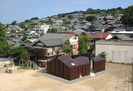 Общественный туалет от Future-scape Architects расположен на острове Ибукидзима (Япония). В композиционном смысле он представляет собой несколько объемов, сгруппированных вокруг небольшого пространства. Создается впечатление, что один большой объемный элемент разрезали на несколько частей. Сходство усиливается благодаря вертикальным узким вставкам из стекла. В ночное время они напоминают ровные разрезы. Фасады сооружения из металла обшиты гидроизолирующим полимером.
