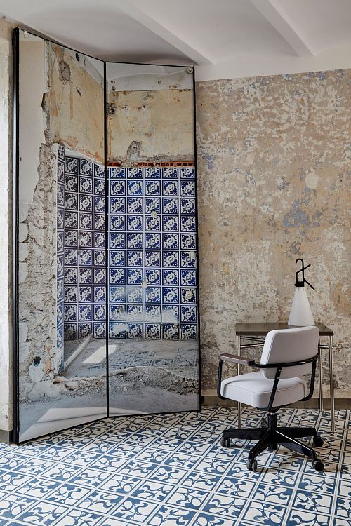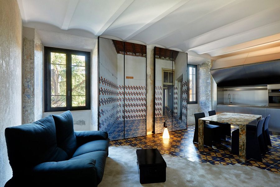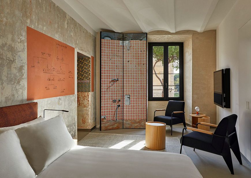 Перед известным французским архитектором была поставлена задача создать интерьер, «в котором чувствуется ход времени». Именно поэтому во всех комнатах отеля можно увидеть потертую керамическую плитку, потрескавшуюся штукатурку, кирпич со сколами. В то же время в отделке кухонь и ванных комнат применены современные материалы, к примеру, листы нержавеющей стали. Интересный элемент интерьера – зеркальные складные экраны, позволяющие организовать пространственную игру с обманом зрения. По словам мэтра, дизайн апарт-отеля строится на противодействии и взаимодействии разных эпох – от глубокой древности до современности.
