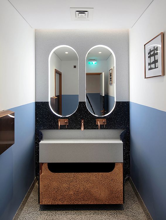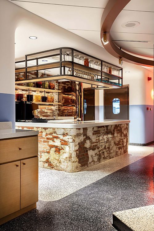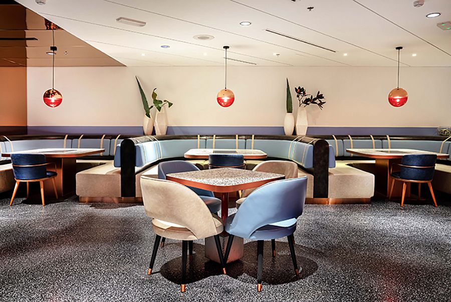 В этом твердо убеждены архитекторы дубайского бюро 4Space, создавшие внутреннее пространство ресторана AtmosFire (площадь более 500 кв.м) в столице эмирата. Основой образного решения интерьера стала зона барбекю, где по праздникам собирается вся семья. Центр композиции заведения – огромная жаровня, выложенная искусственно состаренными кирпичами с измененной геометрией.  Вокруг этой кулинарной зоны, состоящей из шести грилей, располагаются поворачивающиеся кресла для посетителей. Сектор освещен спотами, которые вмонтированы в круглую подвесную конструкцию, отделанную медью. Часть потолка также закрыта медными листами, отполированными до зеркального блеска. В стены заведения встроены группы светодиодов, имитирующие световые датчики грилей. Бар оборудован авторскими полками и системами хранения, сделанными из дерева и стали. Прямой, приглушенный и отраженный свет поддерживает общую образную линию открытого огня и пышущих жаром углей в жаровне.