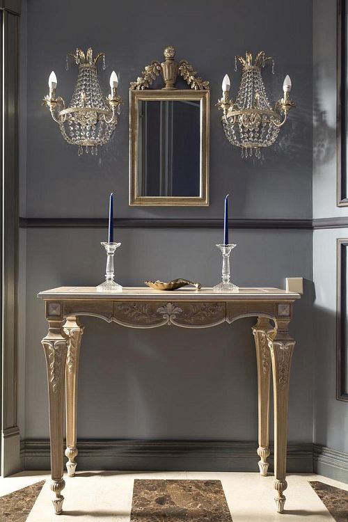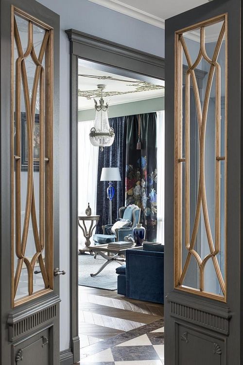 Цветовую гамму для этой квартиры я выбрала торжественную, сине-голубую – для гостиной и насыщенно-лавандовую – для холла. Художник Виктория Фомина специально для этой квартиры написала чудесную картину с замком Снежной Королевы в льдисто-голубых тонах. Комнату родителей я решила сделать в цвет лесного ореха (дымчатый оттенок голубовато-зелёного), в хозяйской спальне пыльно-бирюзовый эффектно оттенила верблюжье-серым оттенком.