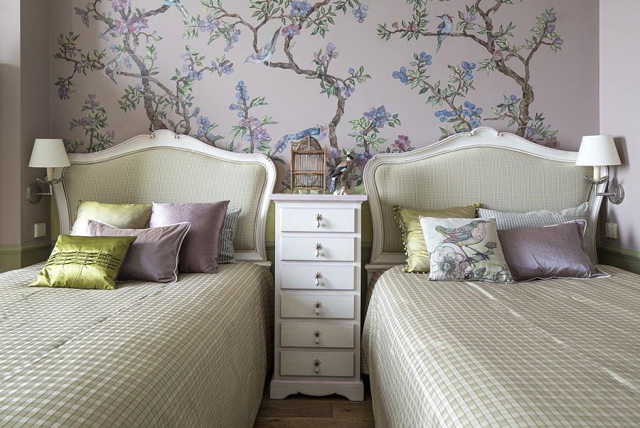 Второй важной составляющей интерьера стала другая находка. Просматривая фотографии одного питерского блогера Романа Везенина, я случайно наткнулась на фото комнаты в старой коммуналке с чудным переплетением яблочных веток на потолке. Внизу был навален хлам, сушилось на веревках белье, а цветы яблони, пережившие и блеск уходящего Серебряного века, и приход новой власти, и гражданскую войну, и холодные зимы блокады, смотрели на все это как небожители, и казалось, что их трепещущие лепестки наполняют ароматом сада старую запущенную комнату. Но воплотить это в жизнь оказалось достаточно сложно. Попасть в квартиру было невозможно, поэтому пришлось рисовать венки из ветвей по фотографиям.