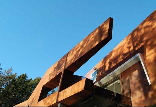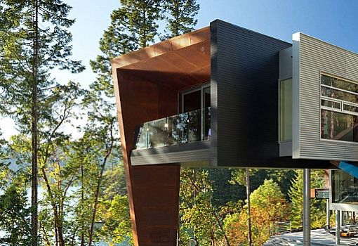 Фасад современного дома, расположенного в заливе Тихого океана на скалистом побережье Британской Колумбии (Канада), действительно покрыт ржавчиной. Этот эффект создает особая сталь (Solanum Steel), которую использовали архитекторы бюро AA Robins Architect для обшивки фасада. Благодаря большой площади остекления и открытым пространствам достигается единство с природой, открываются замечательные виды на залив. При строительстве элементы конструкции изготавливали на материке, после чего транспортировали их на барже, а затем на грузовиках привозили на стройплощадку.