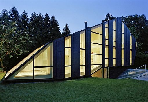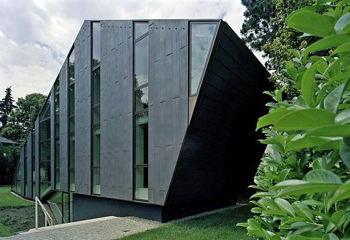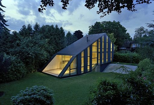 В одном саду Берлина можно обнаружить архитектурный объект в современном стиле - дом W. Клиновидный многогранный объем является лишь «верхушкой айсберга», основная часть постройки находится под землей. Сооружение от бюро Pott Architects демонстрирует сочетание меди и стекла на фасаде кровле, причем металл со временем позволит перевести акцент с архитектуры на окружающие красоты, так как медь дает слегка зеленоватый цвет при окислении.