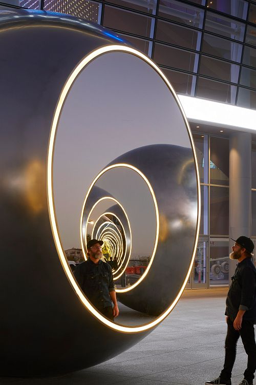 Высота расставленных по кругу шаров из гидроформированной стали — 4,7 м, а диаметр — 4,8 м. В передней части каждой сферы находится зеркальная поверхность, подсвеченная светодиодами. Именно эти споты после включения, отражаясь в зеркале, создают иллюзию туннеля.