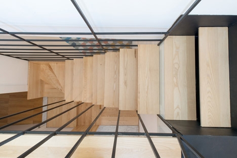 Лестница длиной почти 10 м проходит через зал по вертикали. Она состоит из дубовых досок и поддерживается структурой из уголков, сделанных из черного металла. Сетка 14-миллиметровых в сечении стержней обеспечивает устойчивость всей конструкции. «Когда вы думаете о Сицилии, почти невозможно не попасть в ловушку стереотипов», - сказал Либрицци. – «здесь весьма сильны зодческие традиции». В соответствии с ними архитектор, в частности, облицевал полы шестиугольной и треугольной плиткой.