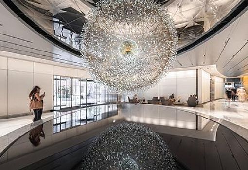 Lucent (дословно – «Сияющий») – это первый проект Вольфганга Буттреса для США. В данном случае речь идет о скульптурной иллюстрации звездного неба северного полушария. Структурно это 4-метровая сфера с 3115 источниками света ручной работы, которые излучают различные типы света, и сгруппированы в «созвездия». Каркас инсталляции выполнен из нержавейки, а на потолке и полу можно любоваться отражениями, которые характеризуются бесконечными повторами.