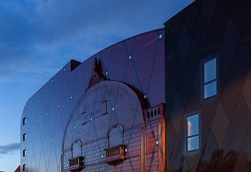 Конкурс на реконструкцию Бетюнского театра комедии прошел в 2009 году, однако реализован проект Manuelle Gautrand Architecture был только в прошлом году. Целью реконструкции стало увеличение площади, ремонт, а так же приведение культурного центра в соответствие с современными требованиями безопасности. Изменения коснулись как интерьера, так и экстерьера. Здание состоит из двух объемов разных форм. Округлый элемент символизирует прошлое театра (он претерпел минимальные изменения), а прямоугольный черный объем – это новая пристройка, дань современности. Обе части композиции «опутаны» ромбами; на красном фоне фасада сетка из черных геометрических фигур выглядит как решетка. Пристроенная часть отделана металлическими листами с похожей текстурой.