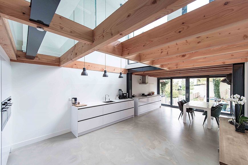 Архитекторы BLOOT расширили цоколь и обустроили там семейную кухню с видом на сад. Кухня связана с открытой просторной верандой. Межэтажное перекрытие между цокольным этажом и первым, где запроектирована гостиная, сделано из толстого закаленного стекла, уложенного на деревянные балки. Это был самый радикальный прием в проекте, использованный архитекторами. Благодаря этому ходу все гостевые помещения визуально объединились: кухня, гостиная, веранда и кровельная терраса на пристройке.