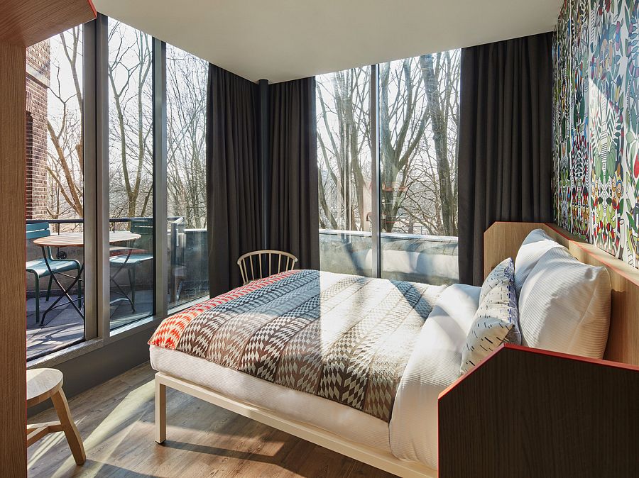 Стратегией архитекторов было – восстановить историческое здание и придать ему черты новизны. Для 168-комнатного отеля архитекторы выбрали эклектичный стиль, который подчеркивает социальную ориентированность бренда. Номера и общественные зоны хостела украшены дизайнерскими предметами декора, такими как обои от Studio Job или фрески Gino bud hoiting, которые органично сочетаются с винтажной мебелью. Кирпичное строение было не только отреставрировано, но дополнено стеклянной надстройкой, вместившей дополнительные номера с панорамными видами на Амстердам. Обновленное здание уверенно «опирается» на традиционную культуру и архитектуру, а также концептуальный дизайн. Ночью хостел привлекает внимание своей иллюминацией, оживляя район.