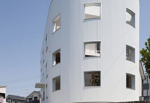 Дом в Хиконе (Япония) от архитекторов Tato Architects стал отличным дополнением городских пространств. В общем виде сооружение представляет собой объем с 42 окнами, при этом предназначается двухэтажное жилище для одной молодой пары. Помимо неординарного архитектурного решения авторы использовали определенные новации в интерьере. Так, стол трансформируется в лестницу: деревянная конструкция высотой 75 см опоясывает полукруглую стену и плавно переходит в винтовую лестницу.
