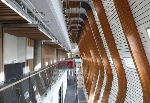 В Ванкувере (Канада) архитекторы бюро B+H реализуют проект студенческого центра. Рендеры проекта AMS Student Nest демонстрируют своеобразную концепцию с элементами промышленного стиля. Неординарные решения есть как в архитектуре, так и в интерьере будущего здания. Чего стоит хотя бы антресольный объем из дерева, расположенный на опорах в атриуме.