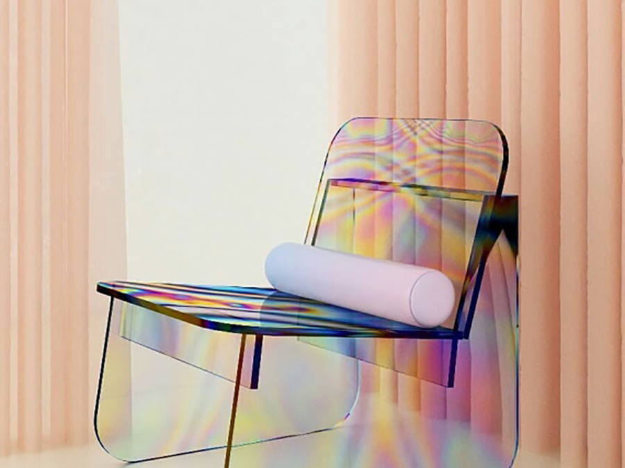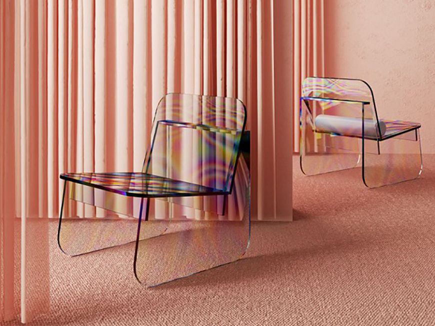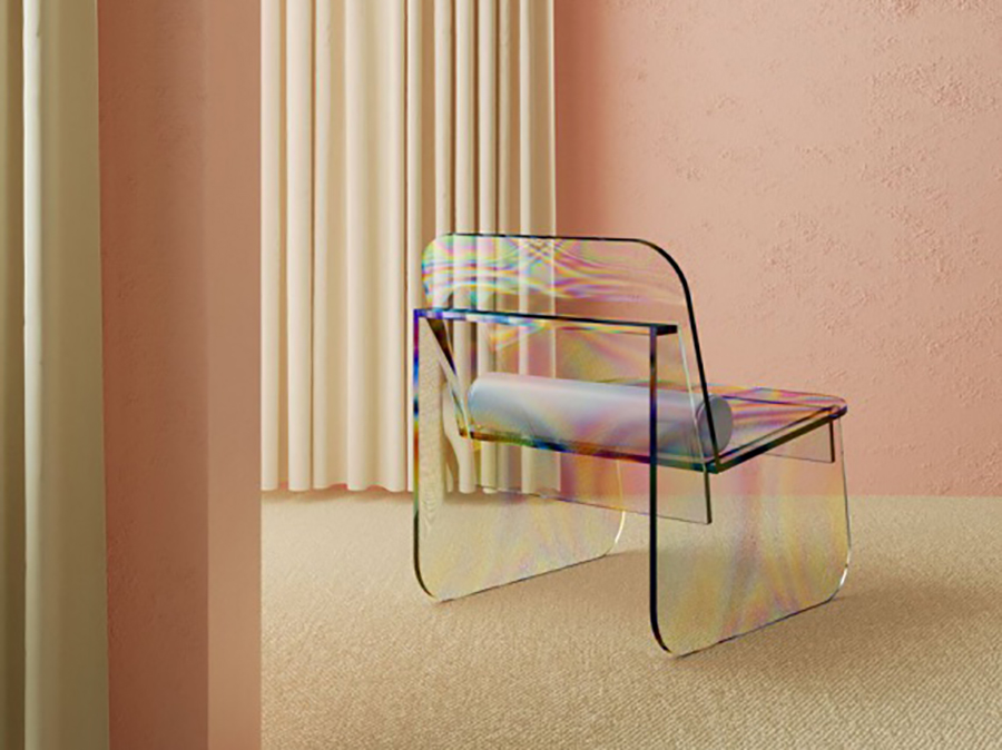 Модель Oil Chair сделана из нескольких скругленных пластин стекла со специальным покрытием, отражающим разные части светового спектра. Радужный эффект меняется в зависимости от угла обзора. В качестве креплений использованы прозрачные штифты, скрытые в толще материала.