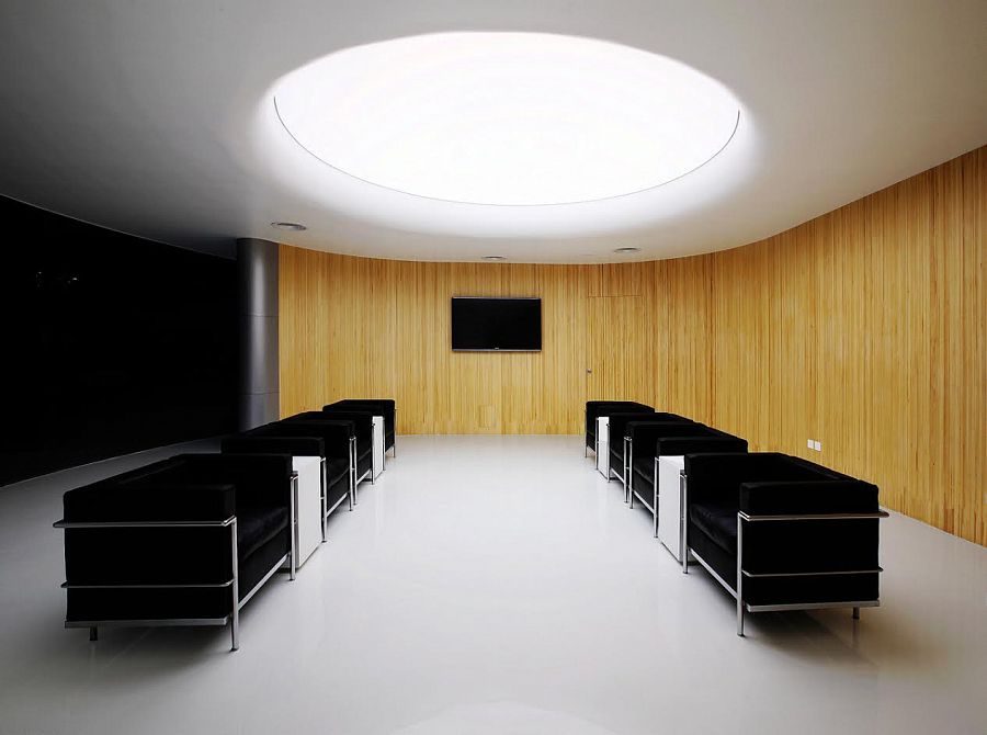 На втором этаже шоу-рума, напротив фабричной стены, находится огромное окно, которое стало естественным демонстрационным экраном. На этот экран проецируется вся необходимая информация о светодиодном оборудовании. По словам архитекторов, мысль использовать так окно пришла им однажды зимним вечером, когда снаружи было темно, а на стекле с внутренней стороны отражалось все, что происходило в комнате.