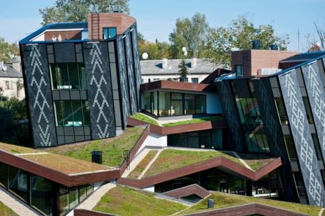 Архитекторы SAALS Architecture создали удачный проект Центра творчества в латвийском Резекне. Он напоминает тектоническую структуру, появившуюся на поверхности земли в результате извержения вулкана. Сходство усиливает тот факт, что здание с озелененными кровлями неразрывно связано с террасированным ландшафтом. И даже деконструктивистские наклонные башенки похожи на суровые мегалиты, торчащие из земли уже многие сотни лет.