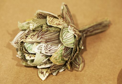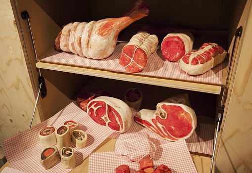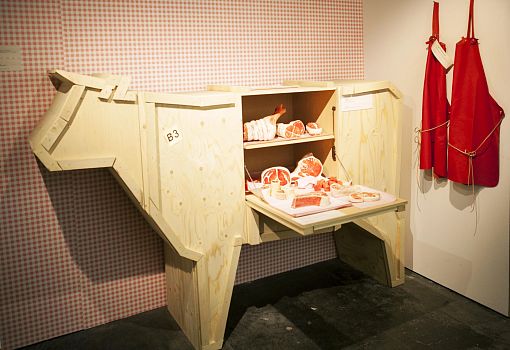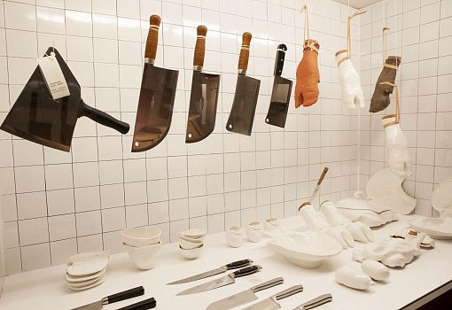 Инсталляция эта полна неожиданностей. С первыми – и самими масштабными из них – знакомишься еще на подходе к объекту: перед нами ламельная стена, собранная из подвешенных багетов, и еще одна ламельная стена, составленная из длинных ящиков с зелеными ростками. Внутри сюрпризы продолжаются: люстра из корнеплодов, люстра из кристаллов соли; миски и блюда, слепленные и из смеси воды, муки и песка; полная столовая сервировка из муки и воды (выпеченные тарелки, столовые приборы и даже «салфетки»). Ваза из натурального воска и имитирующий натуральный воск плафон светильника. Художественные изделия из ткани, имитирующие молоко, и молоко в движении, запечатленное на арт-фото. Мясная «расчлененка» в виде посуды, керамических скульптур-аксессуаров, и текстильных арт-объектов. Сшитые овощи, которые отличимы от настоящих только на расстоянии нескольких сантиметров. И – как апофеоз – тарелки с «обкусанными» краями.