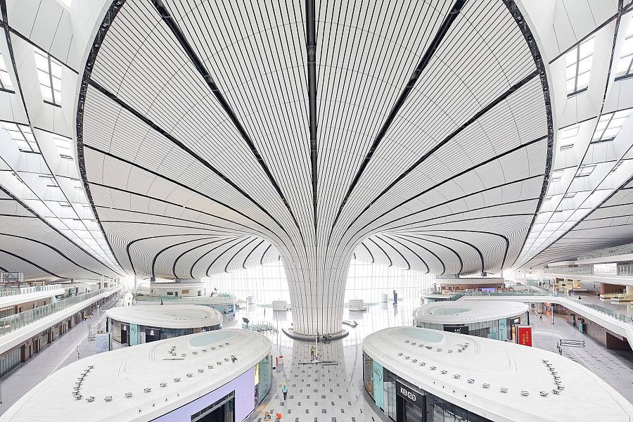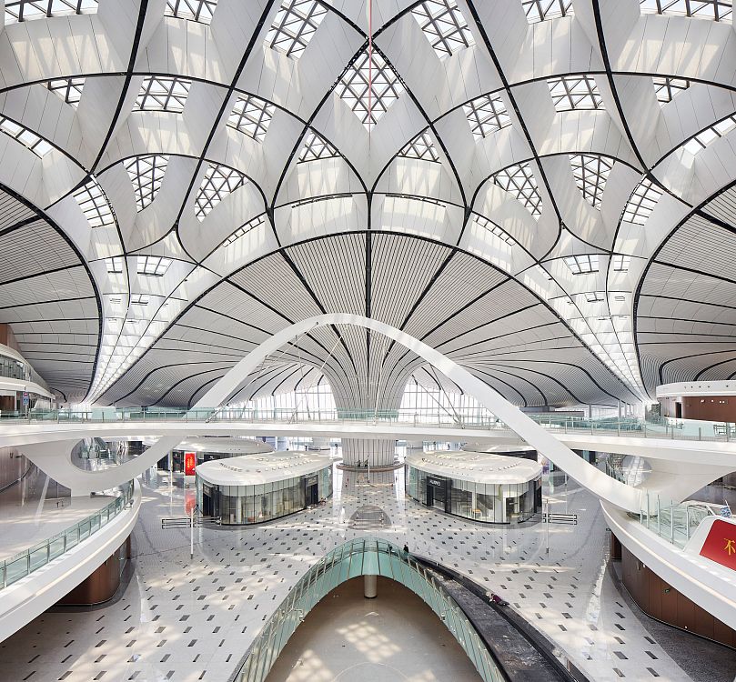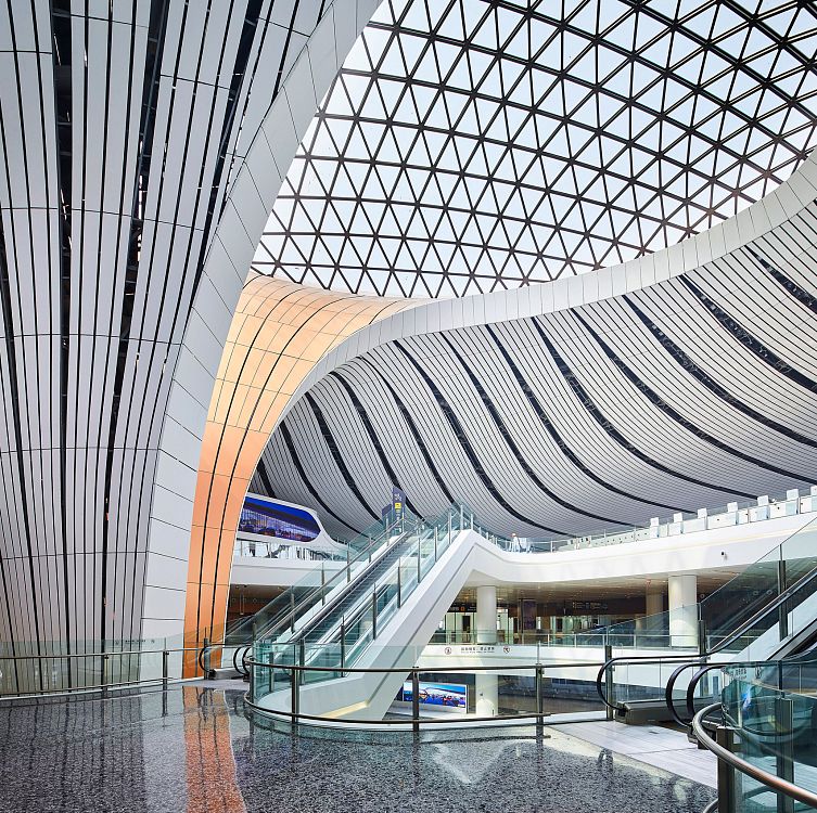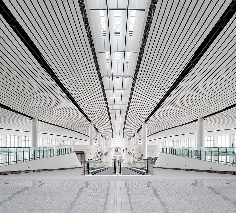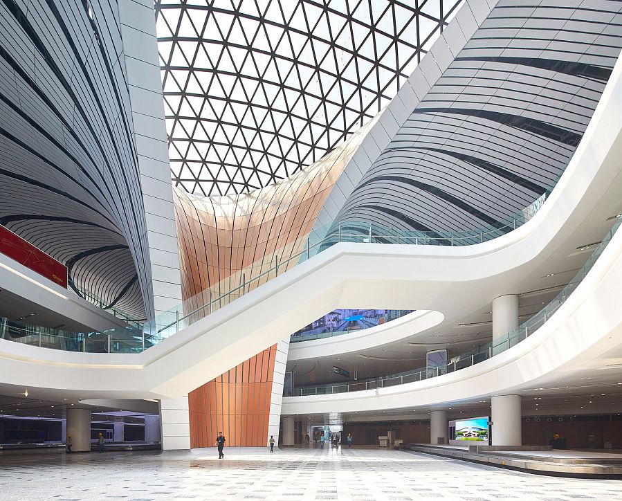 Четырехэтажное здание площадью 700 000 кв.м в плане напоминает геометрически неправильную звезду с пятью лучами, расходящимися от центрального объема со светопроницаемой куполообразной кровлей. Здесь, в сердце терминала, на разных уровнях запроектирован зал регистрации, зоны прилета и вылета, торговые площади. По словам архитекторов, это решение восходит к традициям китайской архитектуры, подразумевающим организацию связанных между собой пространств вокруг внутреннего центрального двора. Шестой луч, не имеющий отношение к авиации, вмещает в себя транспортный хаб со станцией скоростных и обычных электропоездов, а также отель и офисы.