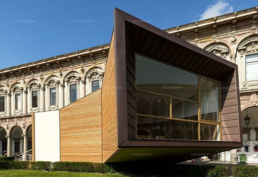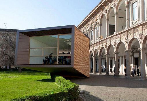 Выстроенный во дворе миланского Университета дом «The View» Луки Скаккетти (Luca Scacchetti) представляет собой своеобразный изогнутый полый «тоннель», который одним концом опирается на землю, а другим зависает на высоте полутора метров от земли. Длина «трубы» - 16 метров, в ширину она имеет  5 метров на нижнем конце и постепенно расширяется до 8, заканчиваясь впечатляющим «раструбом» -  фасадом с панорамным остеклением. Автор сравнивает свой объект с телескопом – и формально (изогнутая труба со стеклянным концом), и метафорически: The View – это вид на архитектуру завтрашнего дня, главные ценности которой – экологичность, надежность, долговременность, рисайклинг.