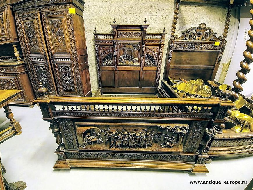 Примером топового предмета мебели в бретонском стиле является эта дубовая кровать, изготовленная французскими мастерами в конце XIX века. На спинке кровати в обрамлении традиционной сквозной бретонской резьбы с удивительной тщательностью вырезана центральная сцена из позднего Средневековья. Быт и нравы того времени отображены максимально реалистично. Передняя часть кровати отображает народные гуляния в обрамлении традиционных бретонских орнаментов. Все элементы кровати украшены фигурками людей в полный рост. Можно насчитать несколько десятков человеческих лиц, причем среди них нет ни одного повторяющегося.