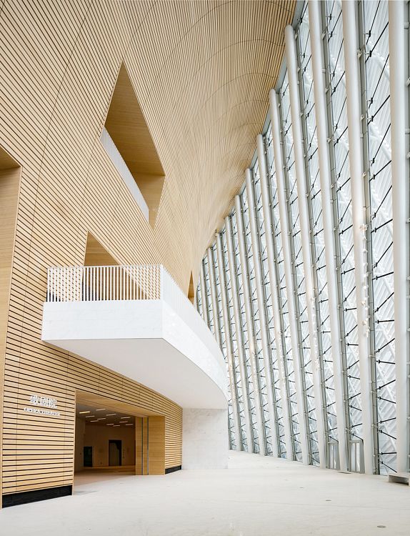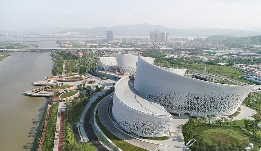 В основе пространственной композиции комплекса лежит традиционный образ цветущего жасмина. Пять архитектурных объемов – это оперный зал, концертный зал, многофункциональный театр, выставочный центр и киноцентр. Все они облицованы белой керамической плиткой. Кроме этого материала в проекте были использованы усиленный стекловолокном бетон, сталь, мрамор и древесина бамбука. Фасады культурного центра оборудованы солнцезащитными экранами длиной около 2 м каждый, причем угол поворота этих плоскостей высчитывался при помощи специально разработанной компьютерной программы. Так разработчики постарались избежать перегрева помещений. Любопытная деталь: для пространства театра была придумана внутренняя оболочка из бамбуковых плит, вырезанных на машинах с ЧПУ. На предварительных испытаниях бамбук продемонстрировал отличные акустические качества.