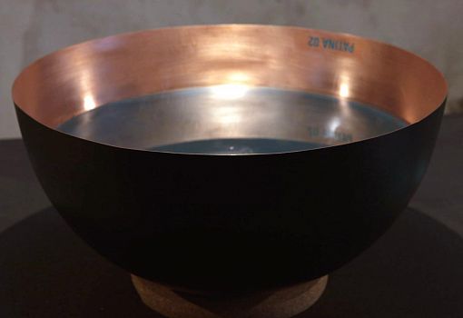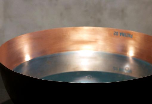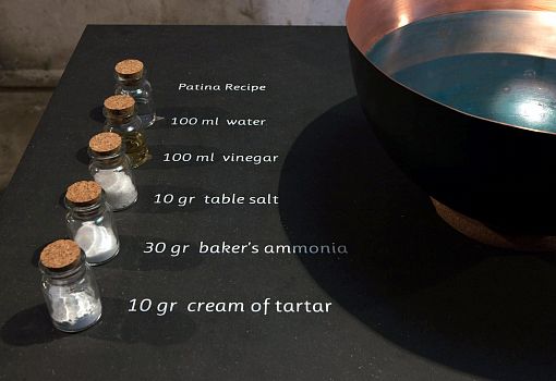 Дизайнеры студии Alhambretto обратились к приемам пищевой химии: они патинируют изделия из меди при помощи состава, приготовленного из стандартных кулинарных ингредиентов – воды, соли, уксуса, пищевого аммония (вид разрыхлителя) и порошка винного камня. Полученный раствор наливается в медную емкость и оставляется на несколько часов. Интенсивность оттенка патины зависит от времени воздействия состава, что дает возможность сделать красивую растяжку цвета.