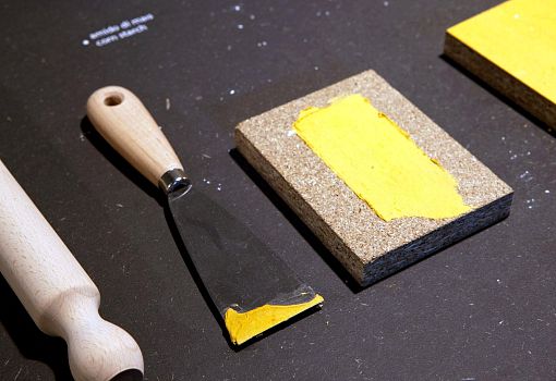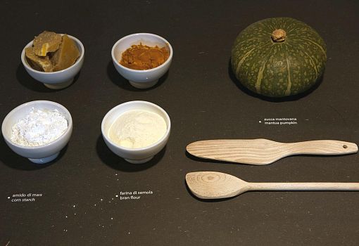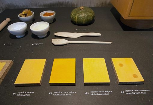 Что можно сделать из тыквы? А что может сделать из тыквы молодой креативный дизайнер?  Алессандро Дзамбелли (Alessandro Zambelli) использует ее для приготовления декоративно-защитного финишного покрытие для мебели. На выставке Foodmade он продемонстрировал проект Cucurbita во всех подробностях от и до:  наглядный рецептурный состав, пастообразный продукт, техника и способы нанесения,  образец готового изделия с этим покрытием.  Дизайнер использует простейшие повседневные продуктовые компоненты: крахмал, цельнозерновую муку,  мантуанскую дыню с яркой мякотью. Они смешиваются в однородную массу, которая затем наносится на поверхность изделия тонким слоем при помощи шпателя. Тыквенный «финиш» отлично сцепляется с поверхностью древесно-волокнистых плит за счет взаимодействия волокон тыквы, полимерных цепей крахмала и древесных пор – так объясняет дизайнер механизм работы состава. Можно разнообразить внешний вид покрытия, используя его в комбинации с воском.  Дзамбелли продемонстрировал четыре варианта: базовый (тыквенно-крахмальная масса в чистом виде), с нанесенным поверх слоем воска и  матированная, с воском и полированная, с восковыми вкраплениями а-ля «маркетри».