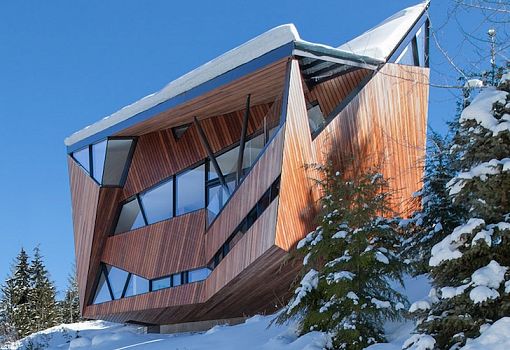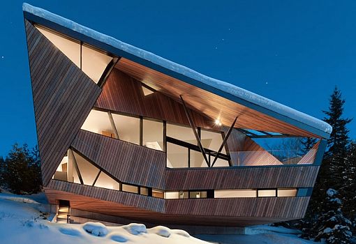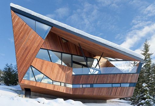 В одной из канадских провинций архитекторы Patkau Architects построили шале нового типа со сложной ломаной геометрией. Сделано это для того, чтобы избежать скопления снега на крыше и подчеркнуть своеобразие здания. Дом площадью 460 кв.м. выполнен из дерева, стекла и металла. В качестве фундамента используются опорные бетонные плиты.