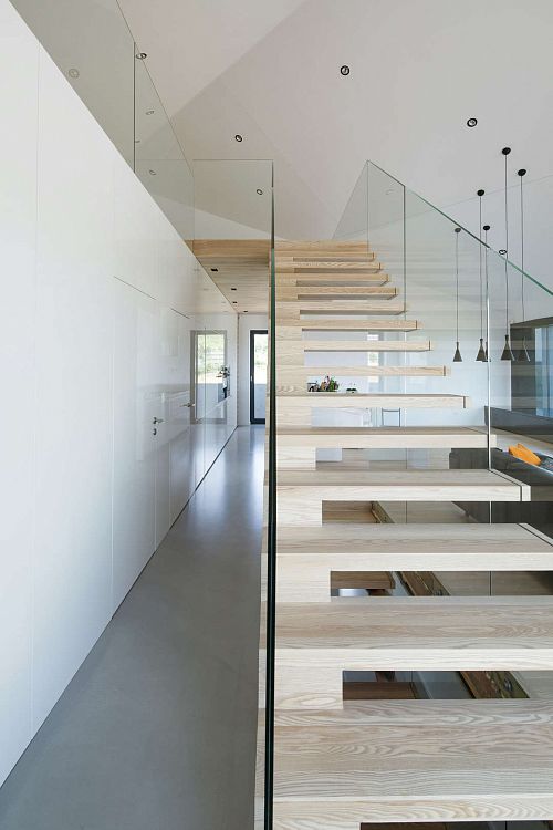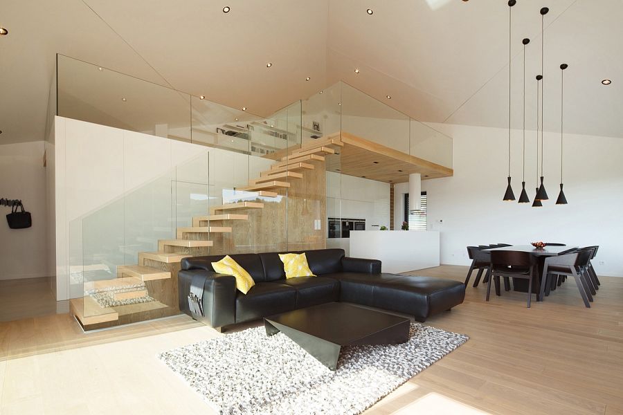 Основой в разработке проекта стали холмы и леса, в общем, окружающий пейзаж. Здание состоит из двух «геометричных» объемов, соединенных небольшим переходом. Жилые комнаты расположены на нижнем этаже основного здания, частично скрытом под землей и незаметном со стороны улицы. Под верхней террасой на первом этаже имеется еще и нижняя. Соединяются они консольной наружной лестницей. На верхнем уровне находится открытая гостиная. Столовая, кабинет, санузел и кухня скрыты в белом параллелепипеде, над которым расположился мезонин. К нижней террасе примыкают две детские комнаты, спальня с гардеробной, ванная, постирочная, а также скалодром. Интерьер дома оформлен в белых тонах. Белые поверхности стен и потолка дополнены полированным бетоном и полом из натурального дерева, деревянными лестницами и темными аксессуарами.