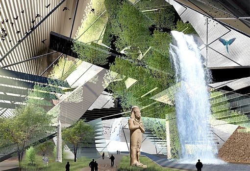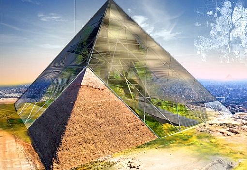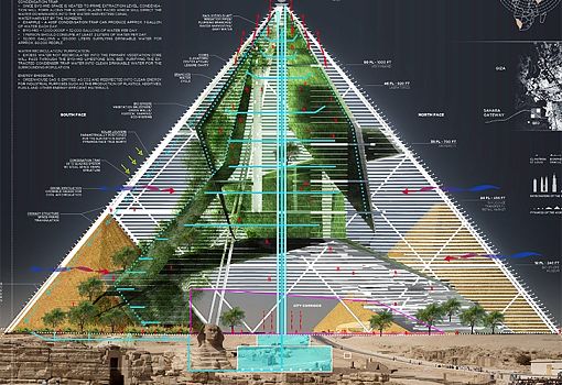 Группа архитекторов из США предложила, пожалуй, самый радикальный проект, который призван сохранить окружающую среду. Концепция получила название «Биопирамида». Если говорить совсем просто, то это своеобразная «пристройка» к одной из многочисленных древних египетских пирамид. Стеклянный объем высотой 390 м, фактически оазис посреди пустыни, словно бы продолжает выложенные из камней грани пирамиды. Благодаря использованию возобновляемых природных ресурсов здание станет автономной архитектурной единицей. По замыслу авторов, такие сооружения позволят замедлить опустынивание территории и создадут потенциал для развития сельского хозяйства и пространств общественного назначения (музеи, рынки, учебные заведения).
