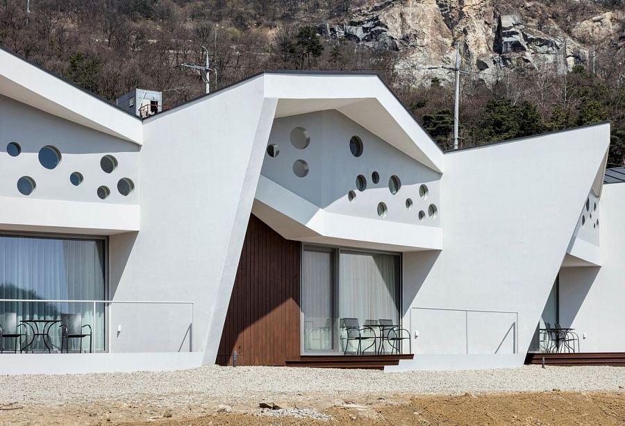 Дизайнеры бюро HG-Architecture и UIA разработали современную концепцию, в основе которой группа модулей. Строения выделяются на фоне горного массива и обеспечивают вдохновляющие виды на реку и близлежащий город. Белоснежные модули занимают площадь 195 кв.м.