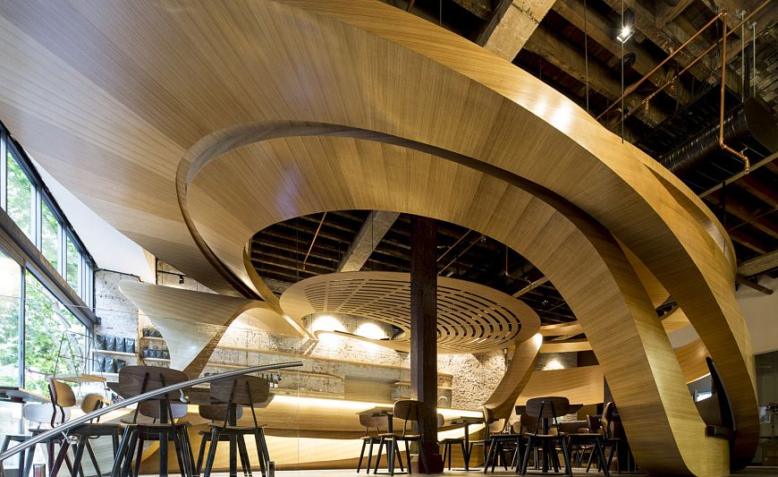 Именно водоворот в кружке кофе стал основой концепции новой кофейни в Сиднее (Австралия). Архитекторы Enter Projects обыграли в интерьере проекта Lot.1 динамику и контрасты материалов.