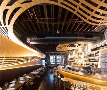 Так, с помощью методов компьютерного моделирования были спроектированы фанерные детали, сочетающиеся с оригинальными кирпичными стенами старого склада викторианской эпохи. Освещение устроено таким образом, чтобы подчеркнуть самые выразительные элементы дизайна и декора. Площадь кафе 945 кв. м, а рассчитано оно на 600 мест.