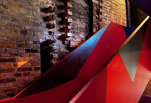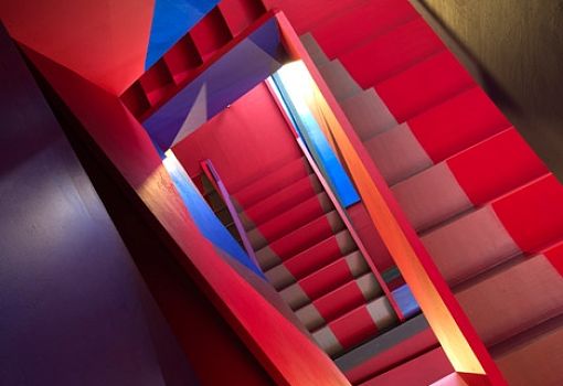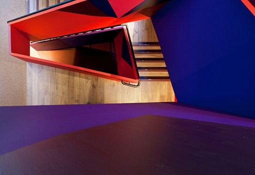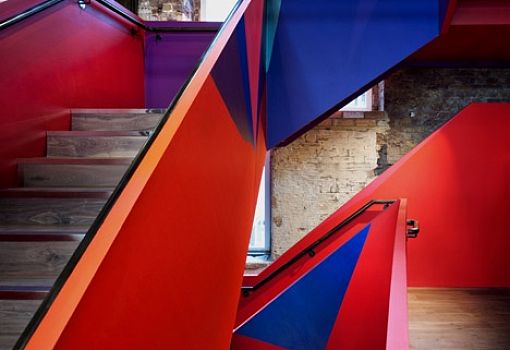 Новое пространство для лондонской театральной фирмы создано на базе старинного склада «Донмар». Задача архитектора Хэворта Томкинса состояла в формировании теплой и творческой рабочей атмосферы. Архитектор выстроил пространство вокруг оригинальной деревянной лестницы. Художник Энтони Малиновский вручную расписал ее яркими оттенками красного, синего и фиолетового. Основную часть интерьера дизайнеры постарались сохранить неизменной, всего лишь обновив потолочные балки и стеновые покрытия. Таким образом, старинная архитектура задает тон всему проекту. Самым серьезным вмешательством в интерьер стало добавление второго света в подвальном репетиционном зале, который был объединен с помещением первого этажа.