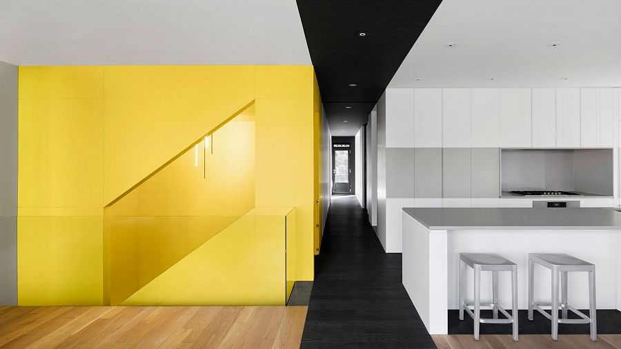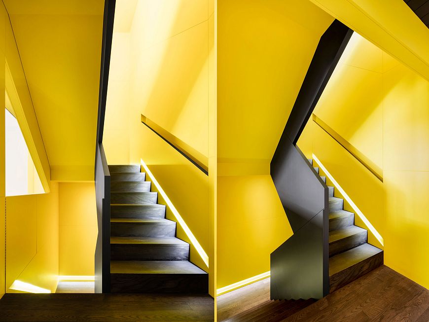 В новом проекте студии Naturehumaine все буквально «вращается» вокруг динамичного объекта – черно-желтой лестницы, которая объединяет этажи.