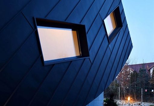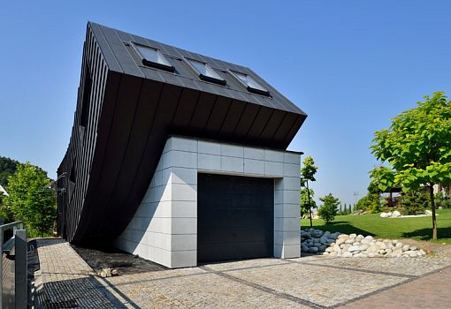 На окраине Вольского леса, к западу от Кракова, польский архитектор Тадеуш Лемански создал жилой дом необычной формы. Свой проект он назвал Domo Dom. Чтобы уместить жилую часть и гараж на небольшомпятне застройки, автору пришлось часть жилого объема резко «загнуть» вверх.Основные помещения – кухня, спальня и гостиная – расположены внутри простого куба, а спальня поднята над «врезанным» объемом гаража. Три окна на крыше пропускают внутрь дома дневной свет.Чтобы здание органично вписалось в окружающий пейзаж, архитектор использовал традиционные материалы: серый песчаник и черные титан-цинковые панели для наружной облицовки. Их контрастные оттенки также усиливают разделение между жилыми помещениями и гаражом.Чтобы подчеркнуть динамизм постройки, боковые окна были «выгнуты» в том же направлении, что и вся конструкция. С обратной стороны установлены стеклянные раздвижные двери, сквозь которые видны терраса и газон.