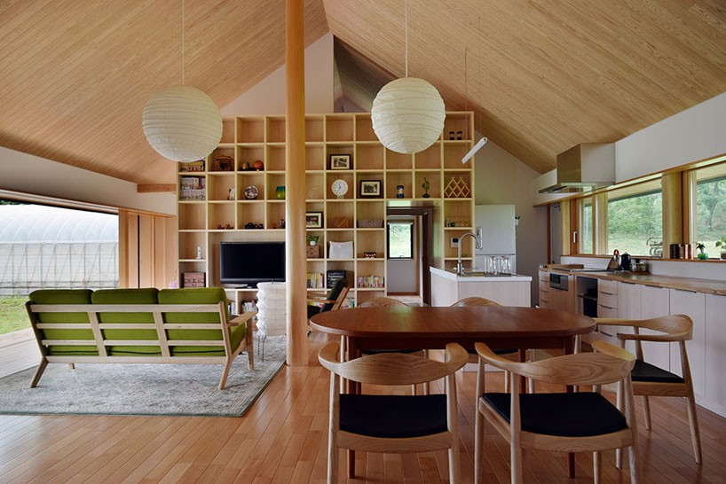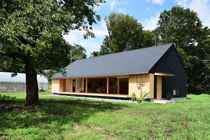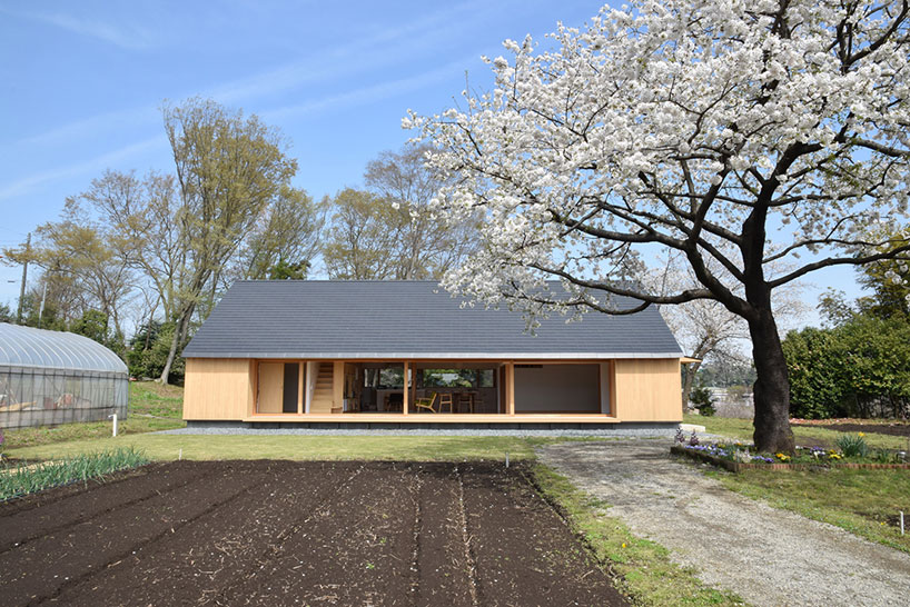 После реконструкции дом в Ацуги отображает простую и архетипичную форму, напоминающую традиционные соломенные фермы, где жили и сами заказчики, когда они были молоды. Внутри создано пространство открытой планировки с высокими потолками - 4,8 м. Здание удачно вписано в окружающий ландшафт, пейзаж является продолжением самого дома. Это еще сильнее подчеркивается огромными окнами по обеим сторонам дома и раздвижными дверями, ведущими на поля. Основным материалом является дерево, придающее интерьеру уютную атмосферу. При помощи раздвижных дверей владельцы могут свободно менять конфигурацию внутреннего пространства жилища.