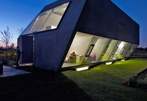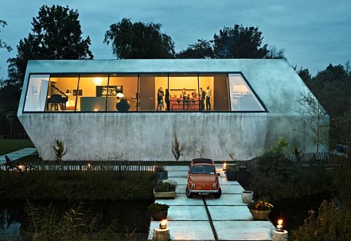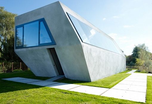 В пригороде Амстердама находится необычный жилой дом, спроектированный VMX Architects. В двух словах объект можно охарактеризовать, как двухэтажный многогранный объем из бетона со значительной площадью остекления. Под некоторыми углами обзора создается впечатление, будто сооружение имеет неестественно большой уклон.